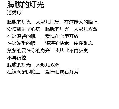 | [00:31.40] | 朦胧的灯光 人影儿摇晃 在这迷人的晚上 |