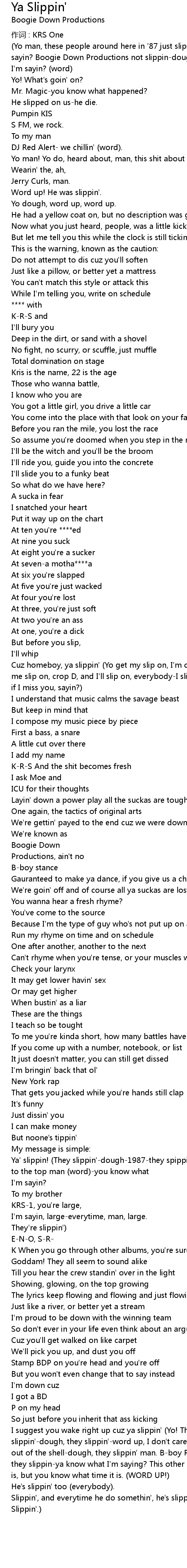 | Yo man, these people around here in ' 87 just slippindough, you know what I' m sayin? Boogie Down Productions not slippindough, so hold ya handsyou know what I' m sayin? word | |