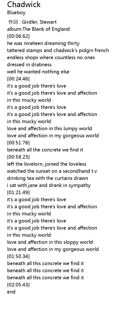 | [00:12.90] | tattered stamps and chadwick' s pidgin french |