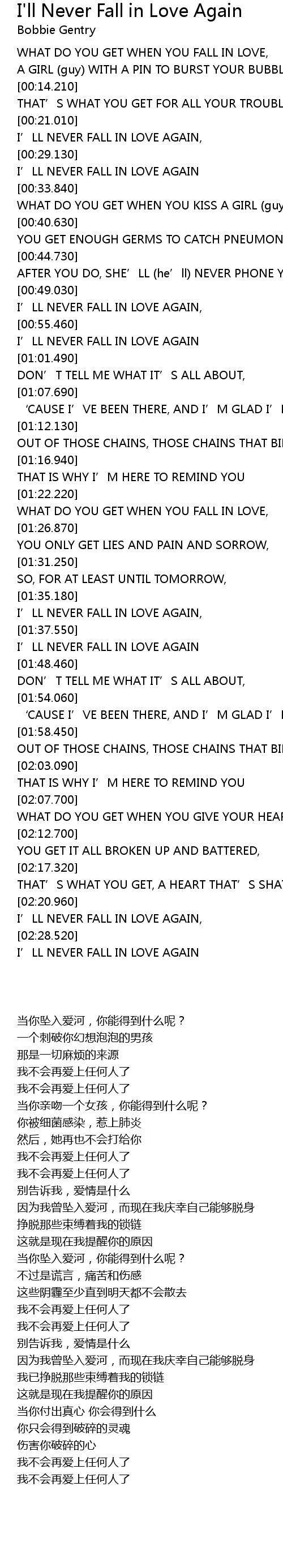| [02:29.070] | I' LL NEVER FALL IN LOVE AGAIN |