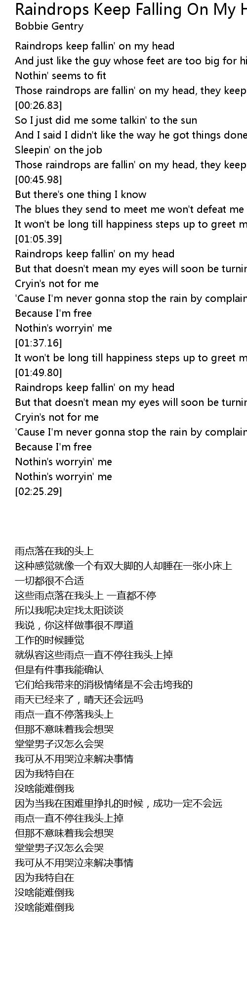 [00:21.39] Those raindrops are fallin' on my head, they keep fallin'