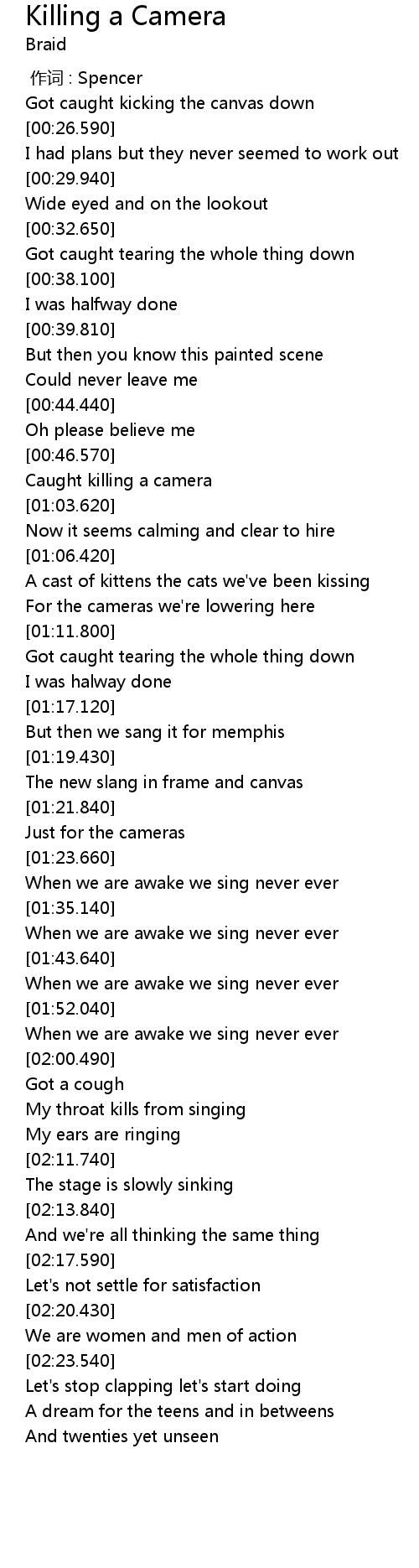 | [01:07.310] | A cast of kittens the cats we' ve been kissing |