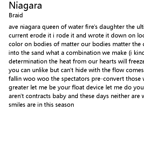 ave niagara queen of water fire's daughter the ultimate author follow the current erode it i rode it and wrote it down on looseleaf paper oh river oh lay color on bodies of matter our bodies matter the colors scatter down our legs into the sand what a combination we make (i kind of like you a lock) with some determination the heat from our hearts will freeze out the lake you have eyes you can unlike but can't hide with the flow comes rise... ave niagara keep on fallin woo woo the spectators pre-convert those water haters look for something greater let me be your float device let me do your swear work cause kisses aren't contracts baby and these days neither are words niagara sugar even odd smiles are in this season |