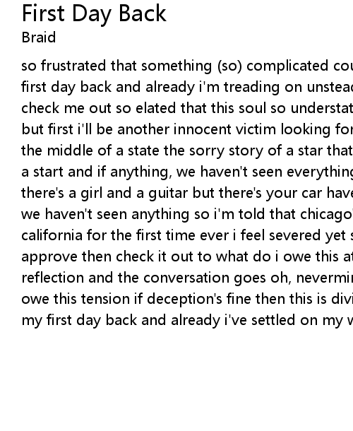 so frustrated that something (so) complicated could hang over my head on my first day back and already i'm treading on unsteady ground so strike me down or check me out so elated that this soul so understated could be making eyes at me but first i'll be another innocent victim looking for some sense of sympathy in the middle of a state the sorry story of a star that goes "here's my heart" it's a start and if anything, we haven't seen everything in the middle of a stage there's a girl and a guitar but there's your car have we forgotten who we are? we haven't seen anything so i'm told that chicago's cold can't be cool as california for the first time ever i feel severed yet smooth removed if you approve then check it out to what do i owe this attention i'm only half of the reflection and the conversation goes oh, nevermind (oh, nevermind) to what do i owe this tension if deception's fine then this is divine divine define divine on my first day back and already i've settled on my weak front |