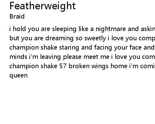 | i hold you are sleeping like a nightmare and asking what time is it and answer but you are dreaming so sweetly i love you completely featherweight she's a champion shake staring and facing your face and thinking we've too much on our minds i'm leaving please meet me i love you completely featherweight she's a champion shake 57 broken wings home i'm coming queen angel 18 home i'm coming queen |