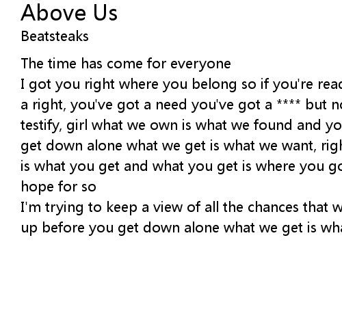 | I got you right where you belong so if you're ready let me know, boy you've got a right, you've got a need you've got a **** but not to keep so now it's time to testify, girl what we own is what we found and you've got to get up before you get down alone what we get is what we want, right above us. cause where you go is what you get and what you get is where you go and where you go is what you hope for so | |