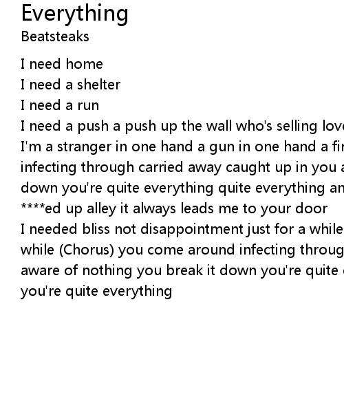 I needed bliss not disappointment just for a while just for a day just for a while (Chorus) you come around infecting through carried away caught up in you aware of nothing you break it down you're quite everything quite everything you're quite everything |