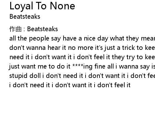 | all the people say have a nice day what they mean man i don't care what they say don't wanna hear it no more it's just a trick to keep me out of the door i don't need it i don't want it i don't feel it they try to keep me in their line they just want me to do it ****ing fine all i wanna say is **** you all i am not your stupid doll i don't need it i don't want it i don't feel it don't wanna have it i don't need it i don't want it i don't feel it |
