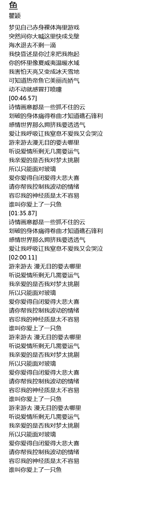 | [01:32.61] | 谁叫你爱上了一只鱼 |