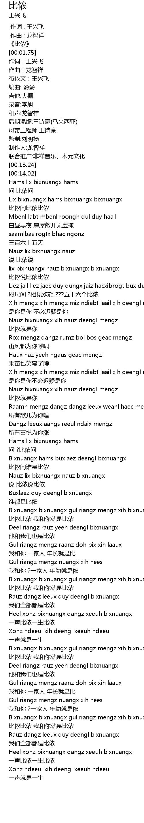 | [02:17.06] | Bixnuangx bixnuangx gul riangz mengz xih bixnuangx |