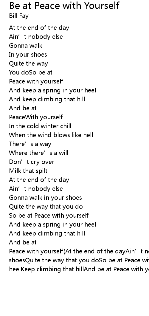 | Peace with yourself(At the end of the dayAin’t nobody elseGonna walk in your shoesQuite the way that you doSo be at Peace with yourselfKeep a spring in your heelKeep climbing that hillAnd be at Peace with yourself) |