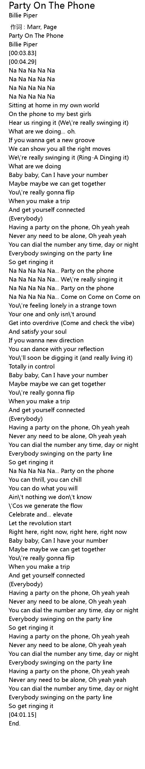 | [02:04.34] | Having a party on the phone, Oh yeah yeah |