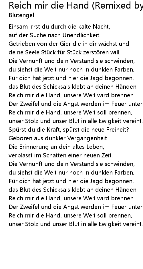 | Reich mir die Hand, unsere Welt soll brennen, | |