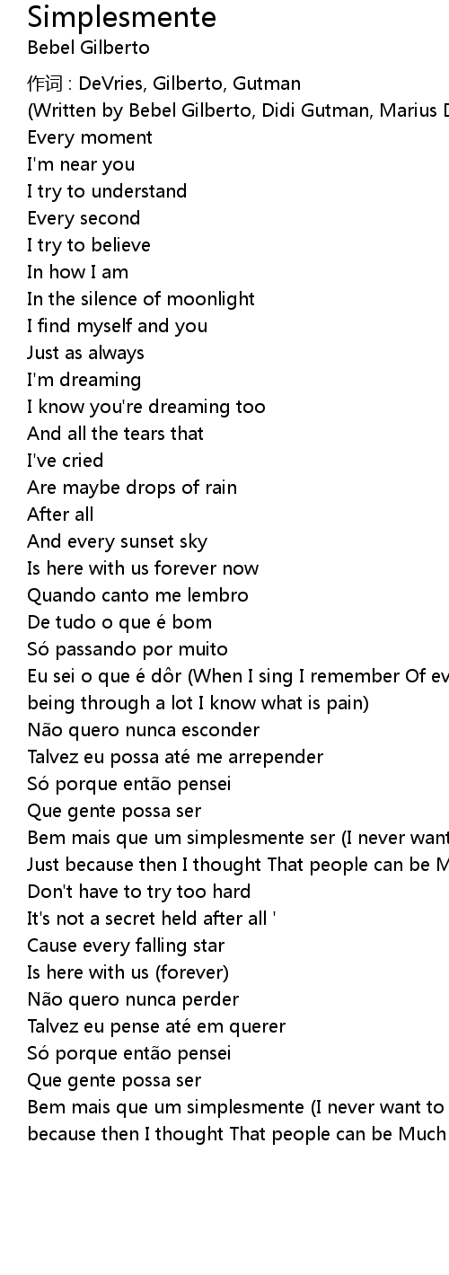 | Bem mais que um simplesmente (I never want to hide Maybe I can even regret Just because then I thought That people can be Much more that a simple being) |
