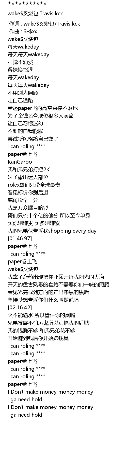 | [00:00.000] | 作词 : wake$叉烧包/Travis kck |