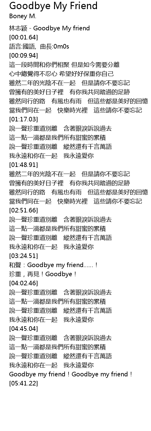 | [00:00.22] | lin zhi ying Goodbye My friend |