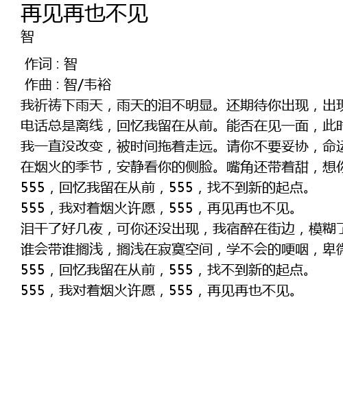 | [03:20.213] | 555,我对着烟火许愿,555,再见再也不见。 |