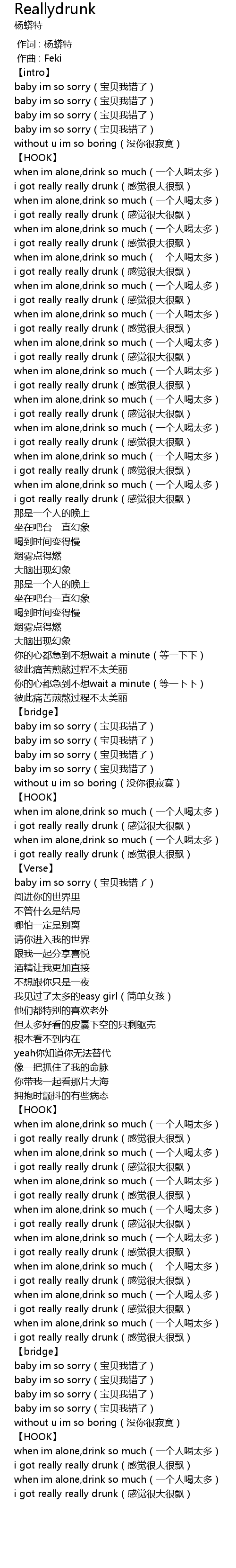 | [00:33.583] | when im alone, drink so much yí ge rén hē tài duō |