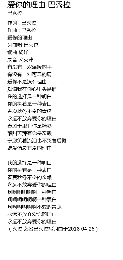 | (秀拉 艺名巴秀拉写词曲于2018 04 26) |