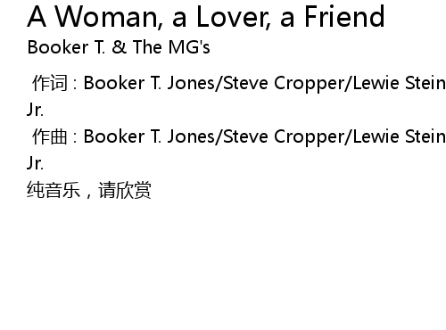 | [00:01.000] | zuo qu : Booker T. Jones Steve Cropper Lewie Steinberg Al Jackson Jr. |