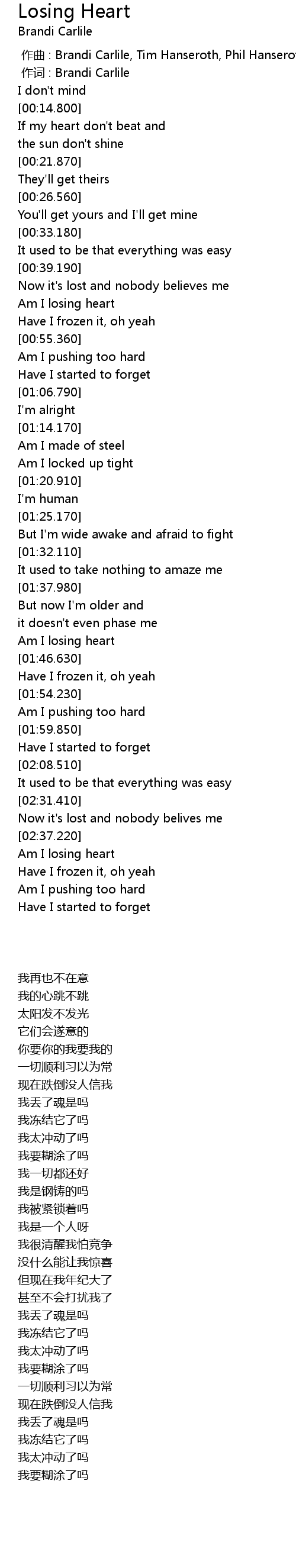 | [00:00.00] | zuo qu : Brandi Carlile, Tim Hanseroth, Phil Hanseroth |