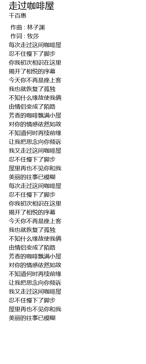 | [00:16.200] | 每次走过这间咖啡屋 |