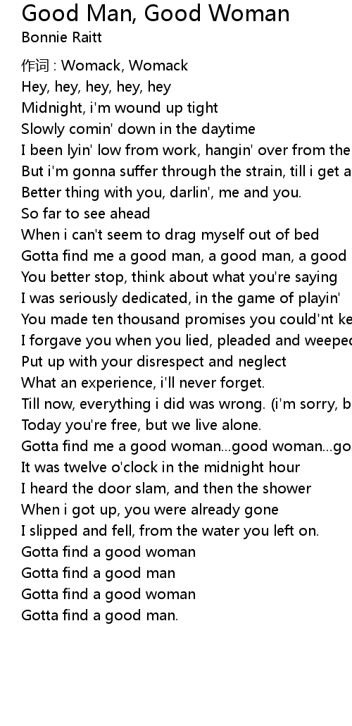 | Gotta find me a good woman...good woman...good woman...yeah. | |