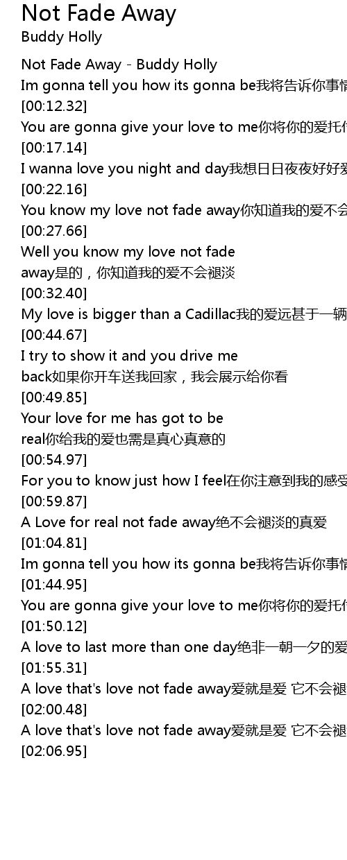 | [00:29.94] | Well you know my love not fade away shì de, nǐ zhī dào wǒ de ài bú huì tuì dàn |