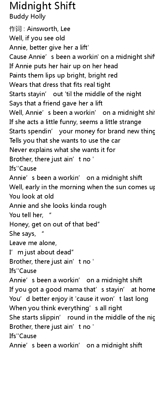| Cause Annie' s been a workin' on a midnight shift | |