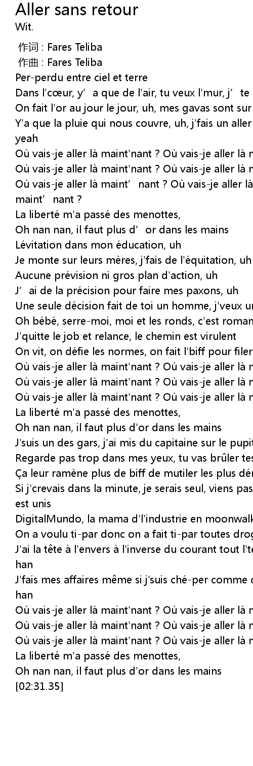 | [00:29.31] | Y' a que la pluie qui nous couvre, uh, j' fais un aller sans retour, yeah |