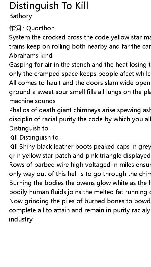 | Phallos of death giant chimneys arise spewing ashes and fire way high the disciplin of racial purity the code by which you all ****in' must die | |