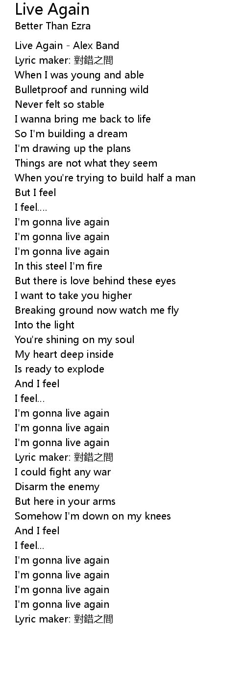 | [00:00.46] | Live Again Alex Band |