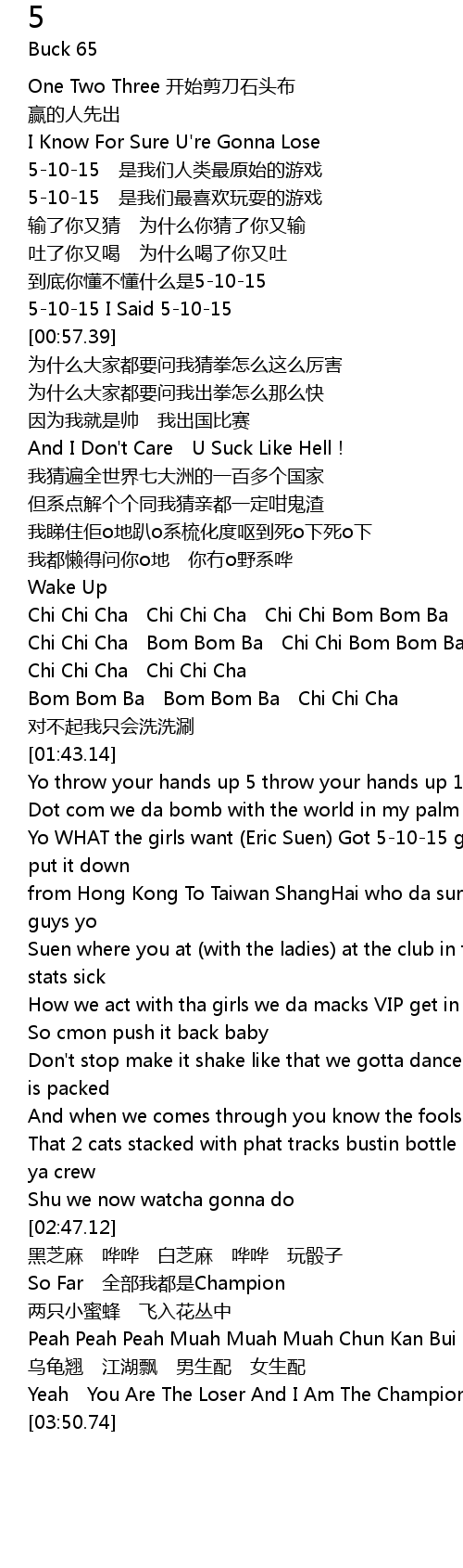 | [01:59.22] | Yo throw your hands up 5 throw your hands up 10 throw your hands up 15 |