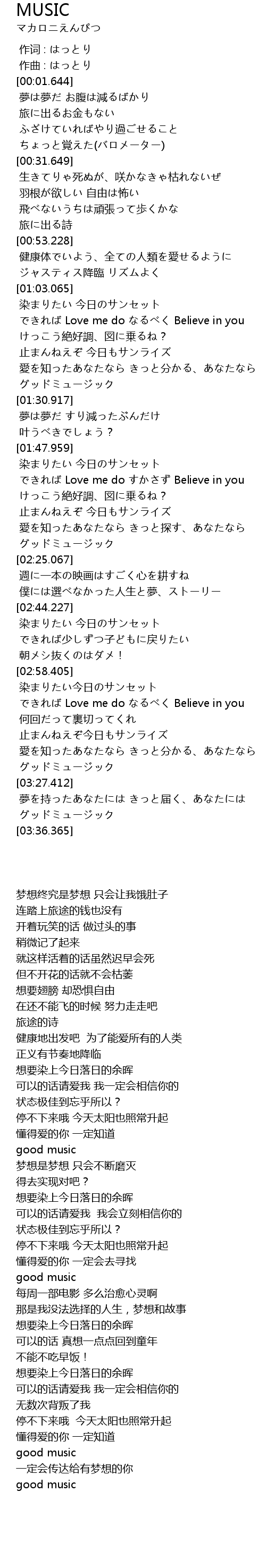 | [03:04.085] | できれば Love me do なるべく Believe in you |