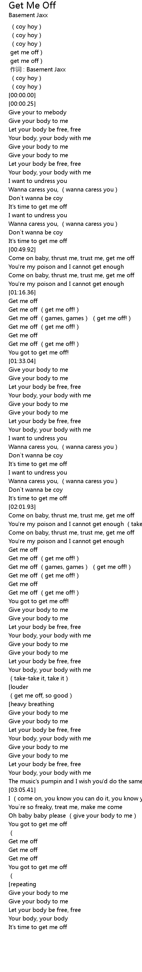 | [01:09.68] | Come on baby, thrust me, trust me, get me off |