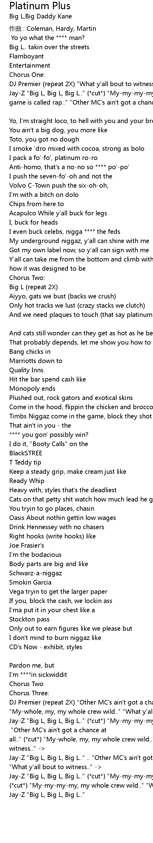 | And we need plaques to touch that say platinum plus cause half of you niggaz that' s rappin now is wack to us Big Daddy Kane | |
