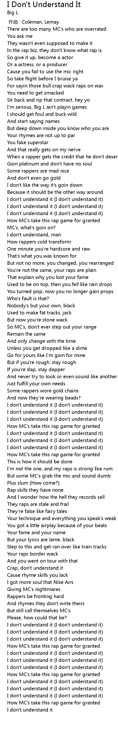 | [01:05.251] | I don' t understand it I don' t understand it |
