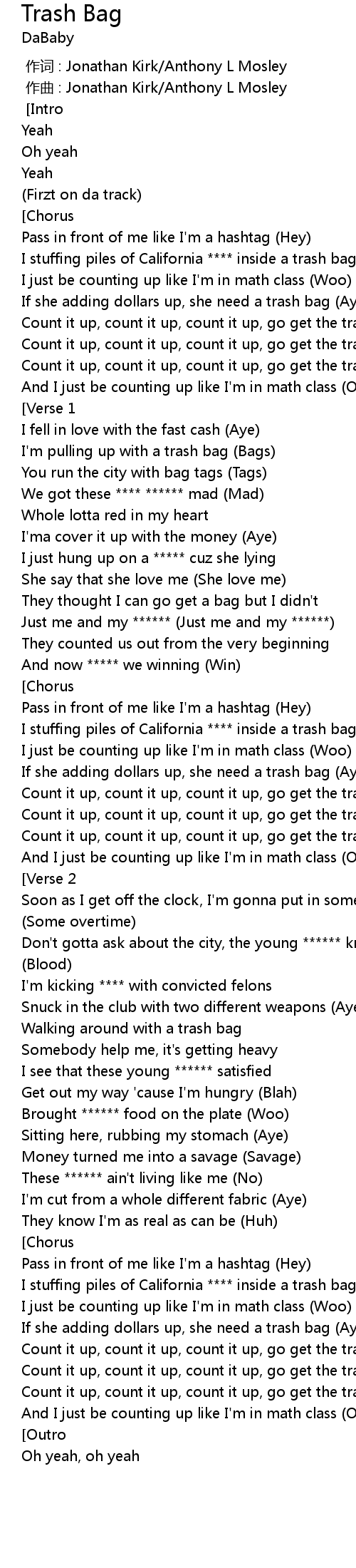 | [02:24.757] | Count it up, count it up, count it up, go get the trash bag (Yeah) |