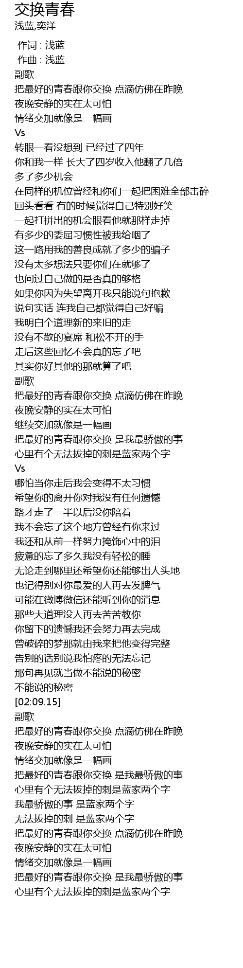 | [02:15.15] | 把最好的青春跟你交换 点滴仿佛在昨晚 |