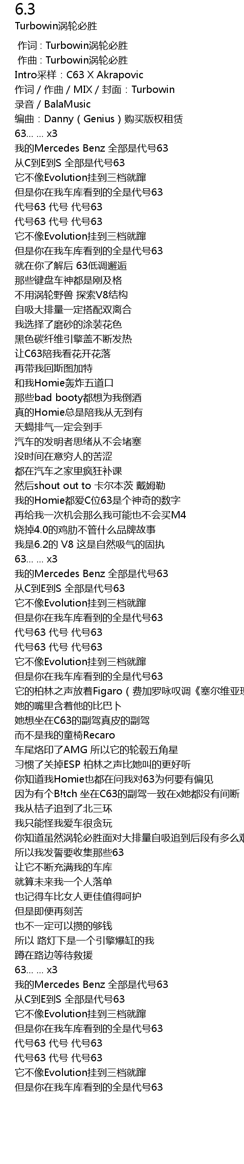 | [03:48.108] | 我的Mercedes Benz 全部是代号63 |