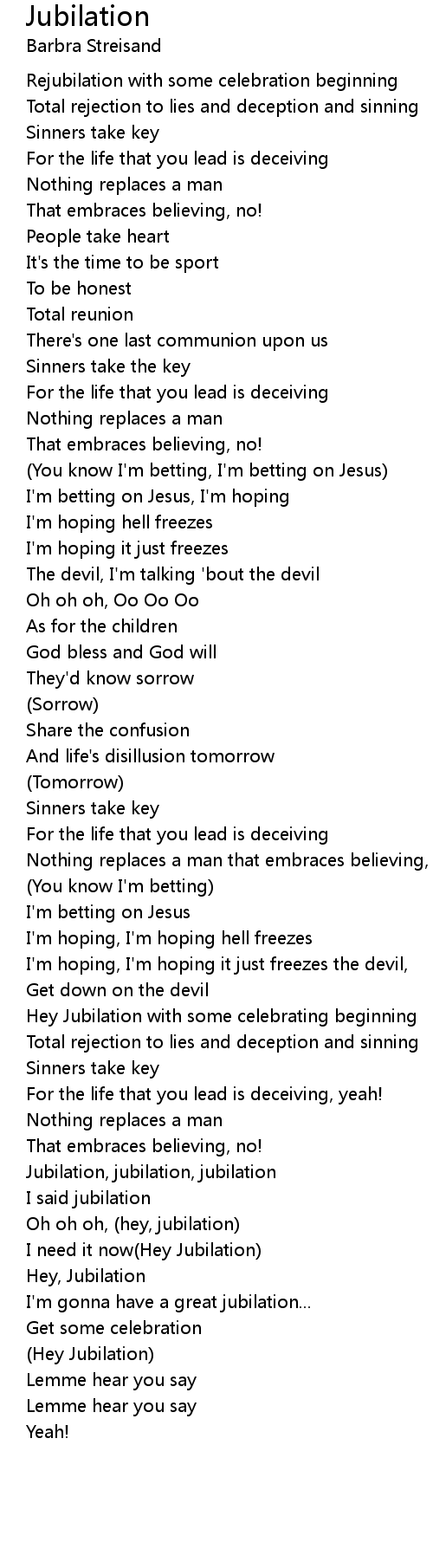 Oh oh oh, (hey, jubilation) |