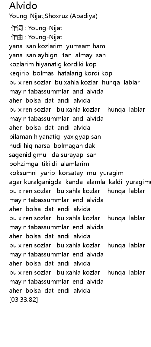 | [02:32.32] | bu xiren sozlar bu xahla kozlar hunqa lablar |