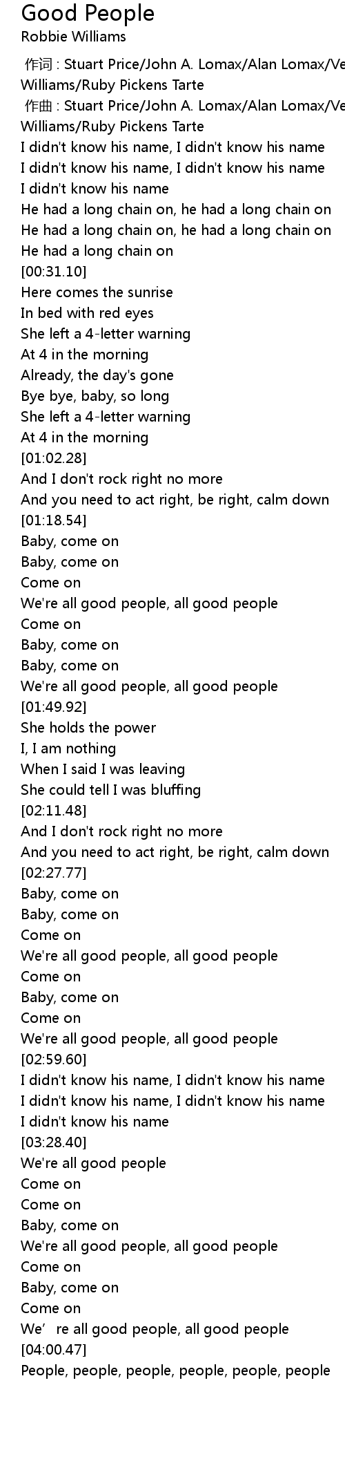 | [00:01.000] | 作曲 : Stuart Price/John A. Lomax/Alan Lomax/Vera Hall/Robbie Williams/Ruby Pickens Tarte |