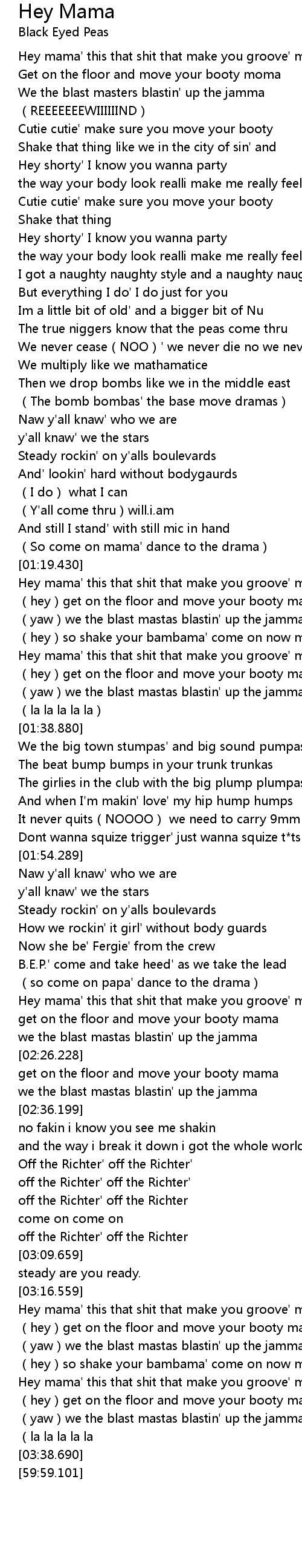 | [01:32.430] | (hey)get on the floor and move your booty mama |
