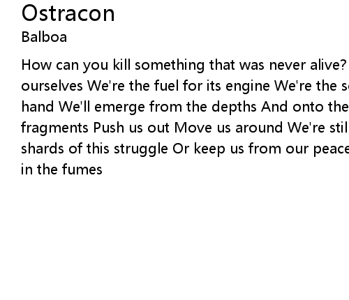 | How can you kill something that was never alive? Even when its so much a part of ourselves We're the fuel for its engine We're the soil for its roots So take my hand We'll emerge from the depths And onto the streets All our pieces All our fragments Push us out Move us around We're still here You can't excavate the shards of this struggle Or keep us from our peace We live in the shadows We live in the fumes |