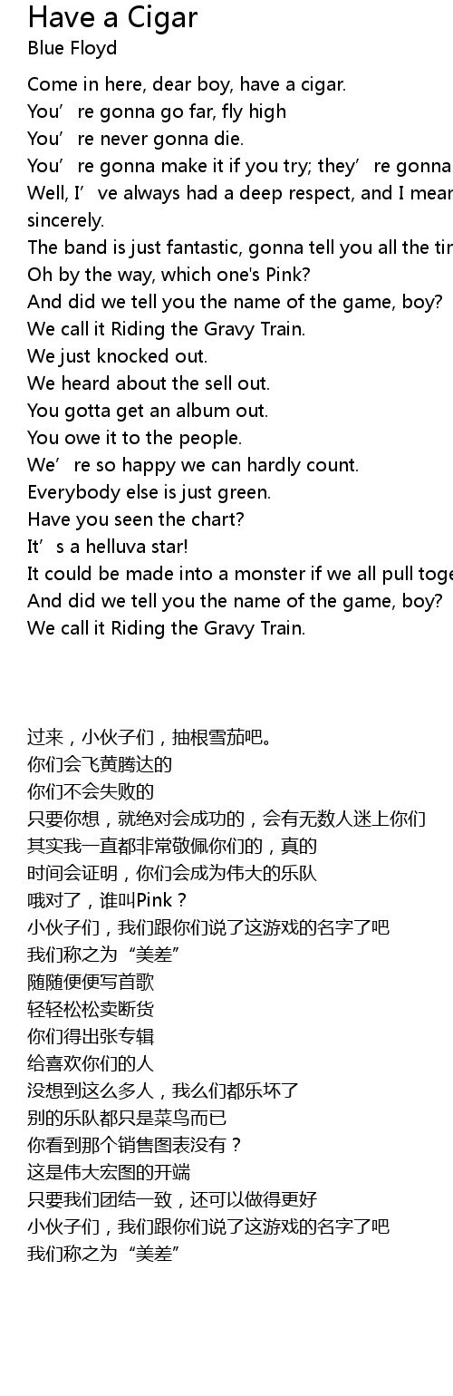 | [01:24.00] | Come in here, dear boy, have a cigar. |