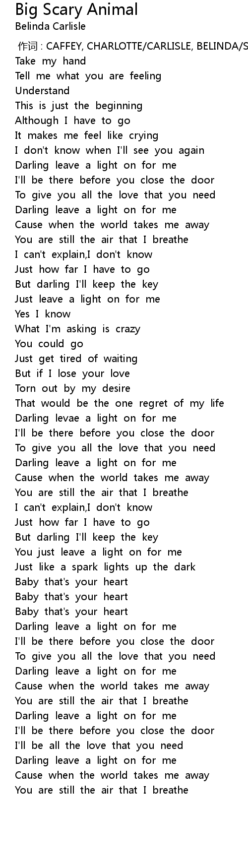 | [00:00.00] | 作词 : CAFFEY, CHARLOTTE/CARLISLE, BELINDA/SCHUKETT, RALPH |