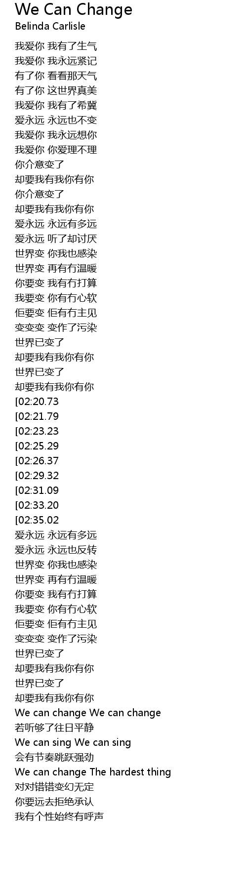 | [03:04.13][02:21.79][01:27.11] | We can change We can change |