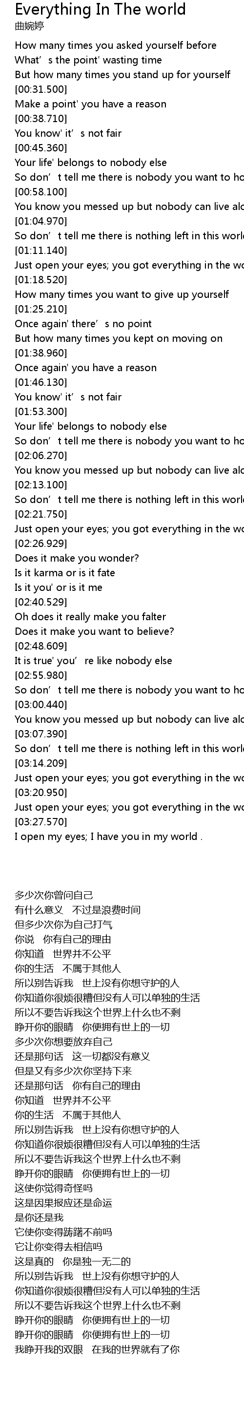 | [03:30.870] | I open my eyes; I have you in my world . |