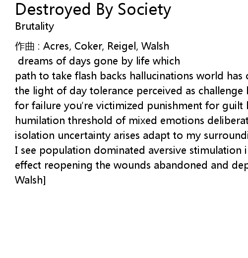 | music by Walsh Acres, lyrics by Coker Reigel dreams of days gone by life which path to take flash backs hallucinations world has changed back into society see the light of day tolerance perceived as challenge hostile environment no excuse for failure you' re victimized punishment for guilt blandly accepting fate humilation threshold of mixed emotions deliberately supressed released from isolation uncertainty arises adapt to my surroundings horrified of what | |